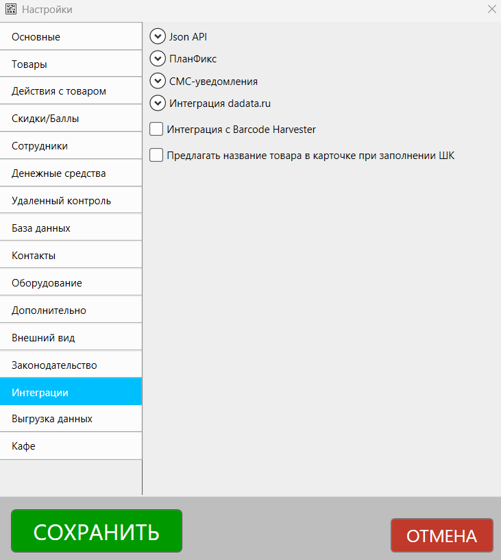Настройки кассовой программы GBS.Market, содержащие параметры взаимодействия с различными сторонними сервисами и системами.