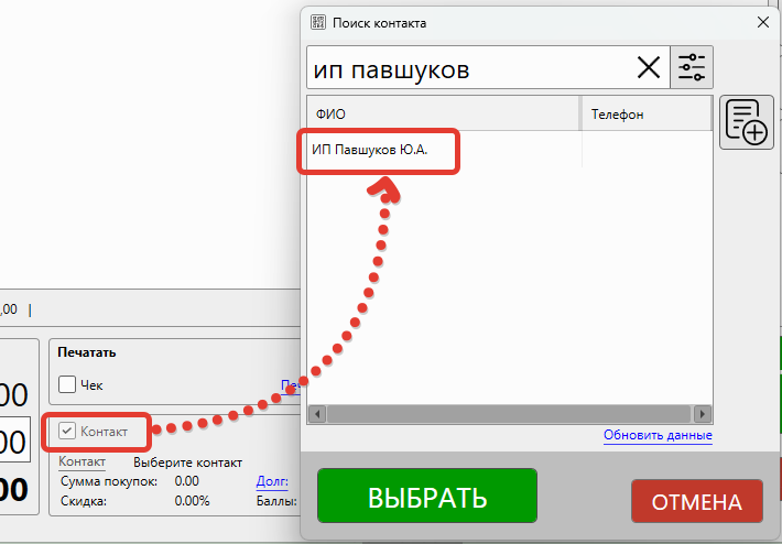 - В открывшемся окне поиска контактов выберите организацию-покупателя (или создайте нового, указав необходимые реквизиты)