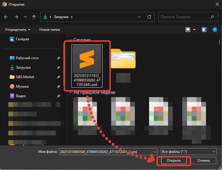 Выберите ранее сохраненный файл и нажмите "Открыть".