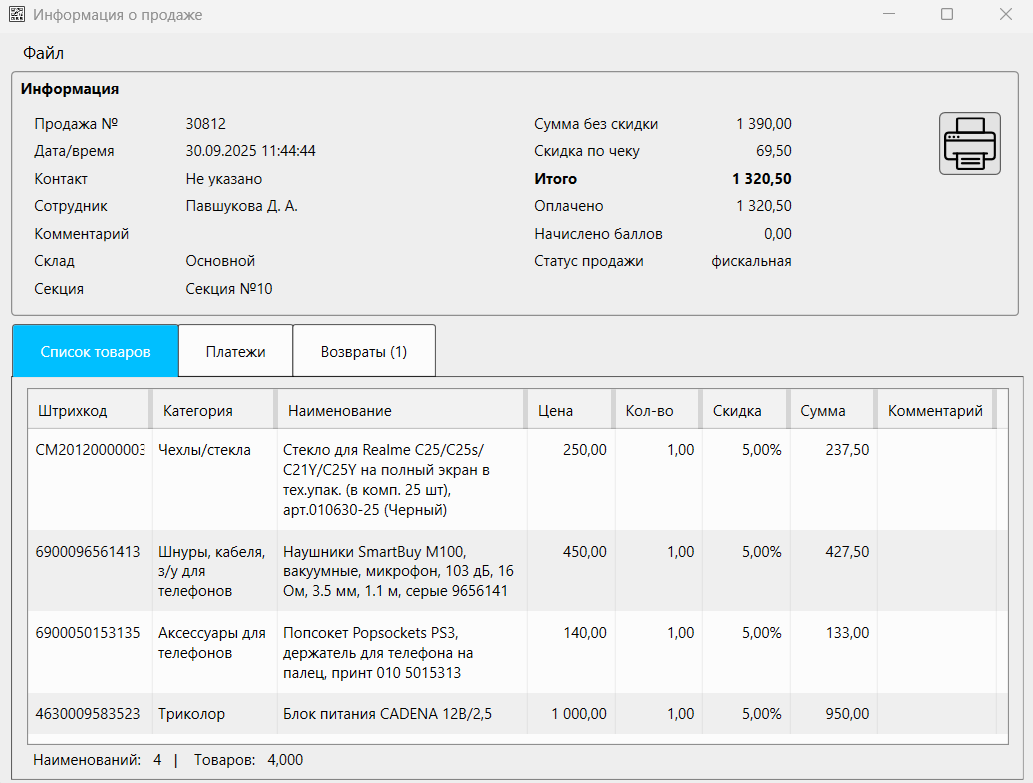 Чтобы открыть карточку продажи перейдите в журнал продаж, кликните дважды на один из товаров искомой продажи или нажмите на кнопку «Информация» на панели управления справа.