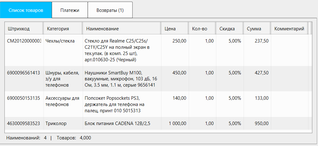 В строке итогов отображается количество наименований и количество проданных товаров.