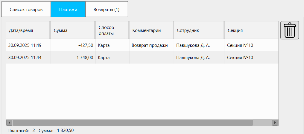 Кнопка «Удалить»: нажмите кнопку, чтобы удалить платеж.
