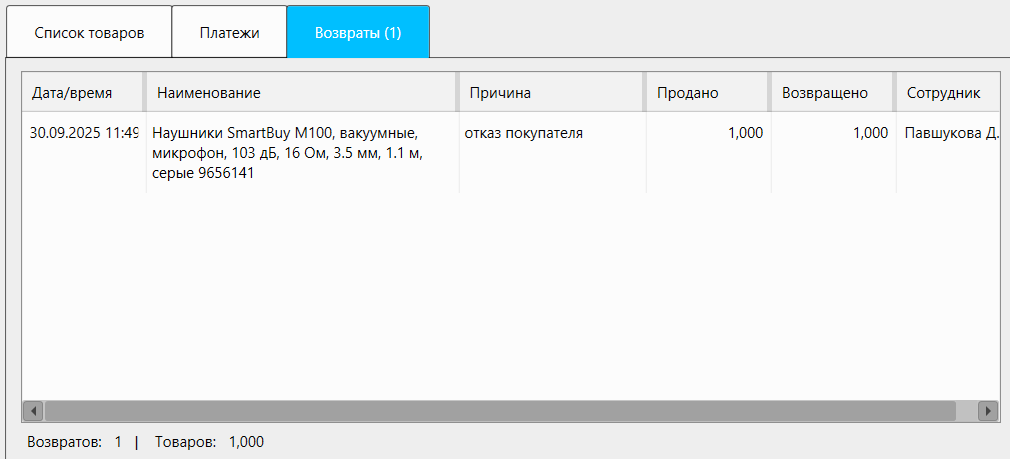 На вкладке «Возвраты» отображается список товаров, которые были возвращены покупателем. Заголовок вкладки отображает количество возвратов.