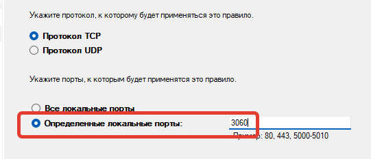 Нажимаем “Далее” и указываем номер порта. Например, для подключения GBS.Market к Firebird это будет порт 3060.