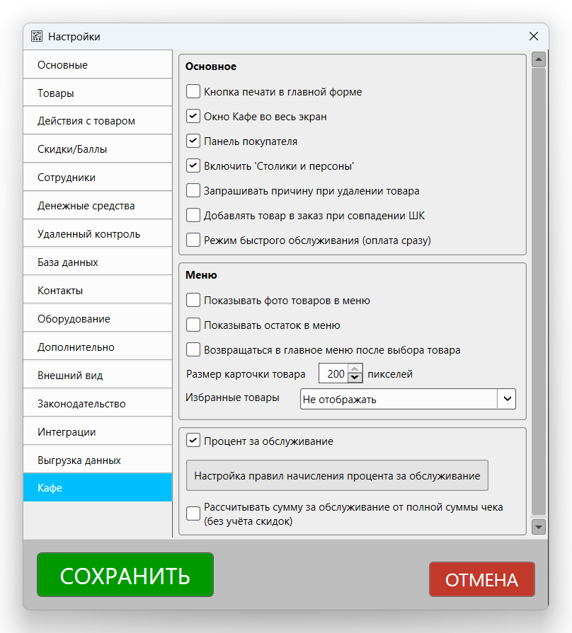 Описание раздела настроек “Кафе”. Открыть настройки можно из главного окна программы Файл – Настройки.