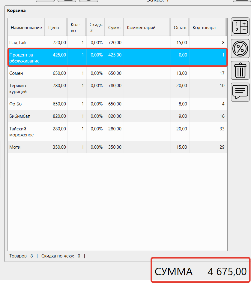 Клиент заказал блюда на 1000 рублей и получил скидку 200 рублей. В этом случае сумма за обслуживание будет рассчитана исходя из полной суммы — 1000 рублей, а не с учётом установленной скидки.