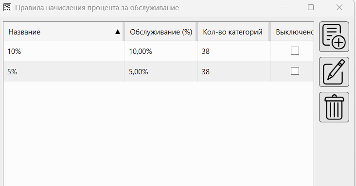 В этом разделе можно создать правила для автоматического расчета процента за обслуживание.