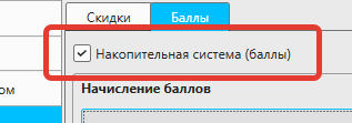 В статье описан раздел “Баллы” в настройках программы. На главной форме нажмите Файл – Настройки, а затем перейдите на вкладку “Скидки/баллы”, далее – “Баллы”.