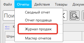 Возврат ранее купленных товаров происходит через журнал продаж. На главной форме откройте Отчеты – Журнал продаж.