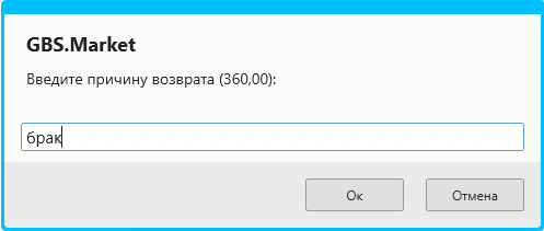 После нажатия кнопки “Продолжить” необходимо указать причину возврата. Например, “брак”.