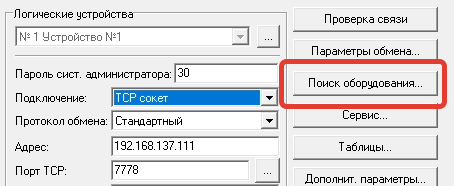 Чтобы выполнить поиск нажмите в настройках подключения кнопку «Поиск оборудования»