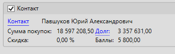В карточке контакта на вкладке “Финансы” можно будет увидеть значения как для локальной базы данных, отдельно для других торговых точек и общую сумму.
