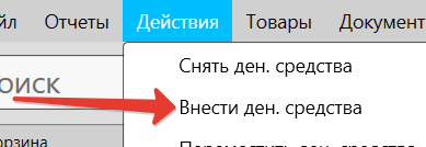 Внести наличные в кассу можно аналогично выемке. Сделать это можно с главной формы программы в меню: Действия – Внести ден. средства