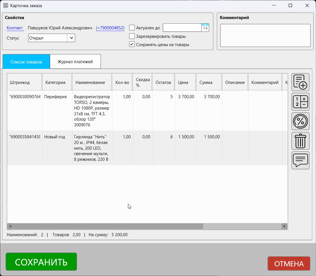 В нижней части карточки заказа/резерва расположены кнопки «Сохранить» и «Отмена».