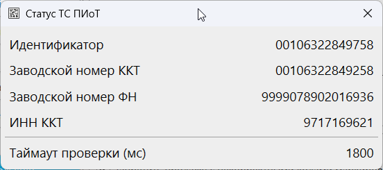 Если подключение к ТС ПИоТ успешно установлено, отобразится информация о подключенной ККТ:
