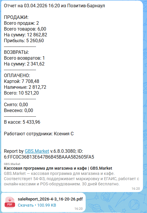 На скриншоте ниже показано, как выглядит отчет из торговой точки, отправленный в MAX. Во вложении к отчету приложен документ в формате PDF, в котором перечислены проданные товары за текущий день.