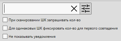 В панели “Поиск/штрихкод” доступно поле для поиска и параметры поведения программы. Нажмите на кнопку “настройки”, чтобы показать дополнительные параметры.