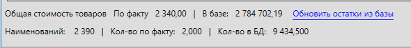 При нажатии на кнопку “Обновить остатки из базы” будет произведено обновление значения поля “остаток в базе”. Это может быть полезно в случае, когда в процессе инвентаризации значение остатка для товаров изменилось.