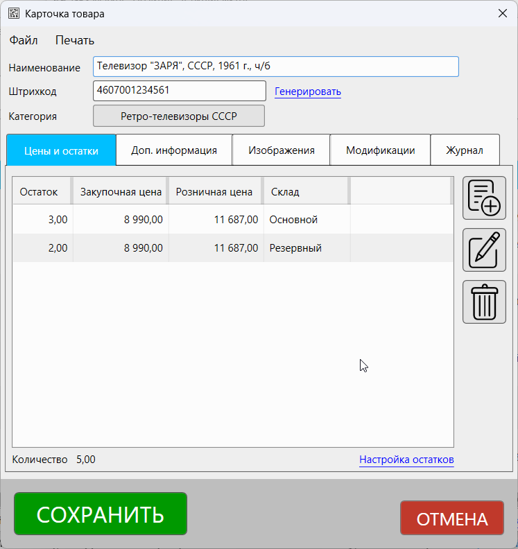 В карточке товара доступно редактирование свойств и цен товара, а также просмотр истории действий с этим товаром.