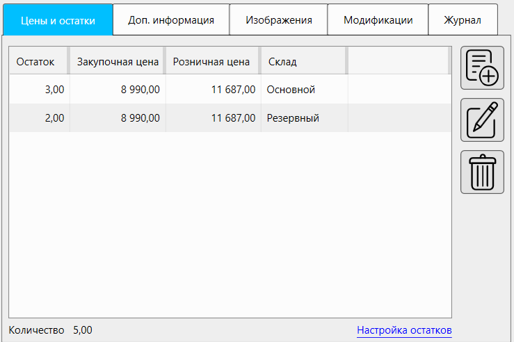 На вкладке «Цены и остатки» доступна информация об остатках по складам и закупочных и розничных ценах товара, а также редактирование этих параметров.