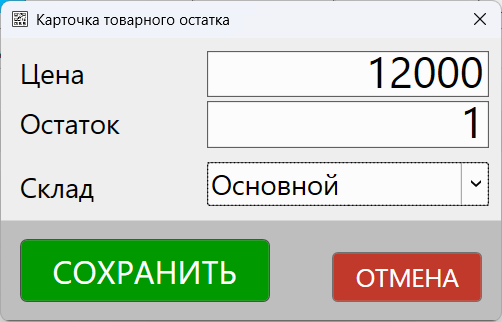 При редактировании товарного остатка в его карточке можно изменить количество на остатке и розничную цену. Изменение принадлежности к складу недоступно.