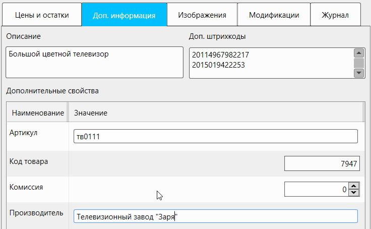 В списке дополнительных свойств по умолчанию указан только код товара. Вы можете добавить неограниченное количество дополнительных полей для товара, указав для них значение. По этим полям может быть выполнен поиск товара.