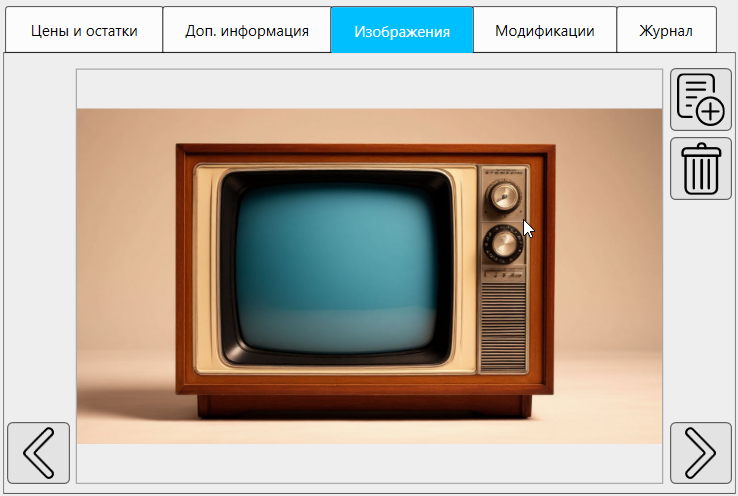 На вкладке «Изображения» доступно управление изображениями товара: просмотр, добавление, удаление. Изображение товара, например, может использоваться в режиме «Кафе» для более удобной визуальной навигации.