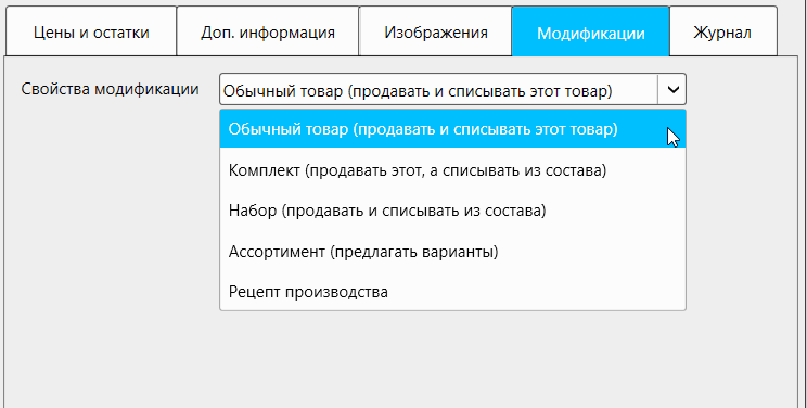 Изменение типа модификации допустимо только до выполнения какого-либо действия с товаром. Стоит учесть, что ручное добавление остатка (изменение количества) является действием с товаром. Поэтому модификация должна быть указана при создании товара.