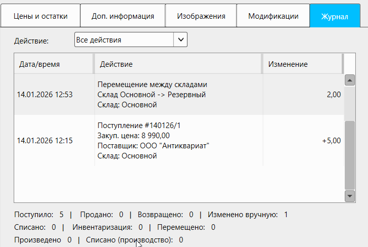 На вкладке «Журнал» доступен просмотр информации об истории товара и все действия с ним: ручное редактирование, продажи, поступление, списания и т.д. При необходимости можно выбрать тип действия для фильтрации записей.