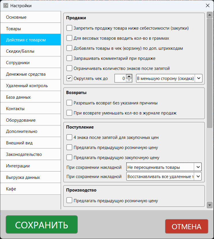 Раздел настроек программы, в котором можно сконфигурировать логику работы для действий с товарами: продажи, возвраты, поступления и т.п.