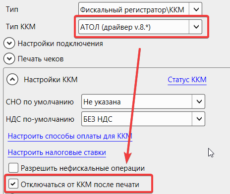 Не все ККМ имеют возможности отключения. В таких случаях опция не отображается в настройках этих ККМ.