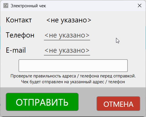 При включенной опции, в момент печати чека, программа предложит добавить номер телефона или email на который будет отправлен электронный чек .