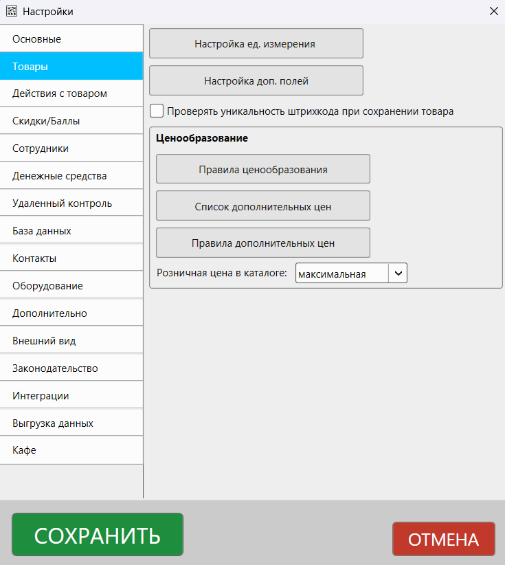 Описание раздела настроек «Товары». Открыть настройки можно из главного окна программы «Файл» – «Настройки».