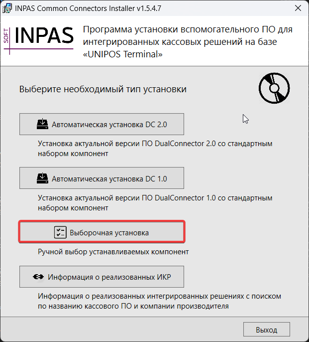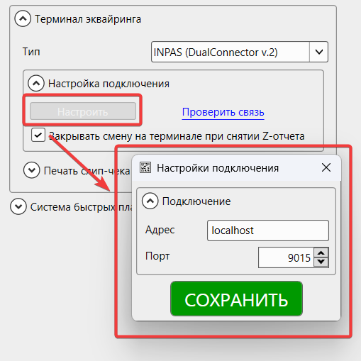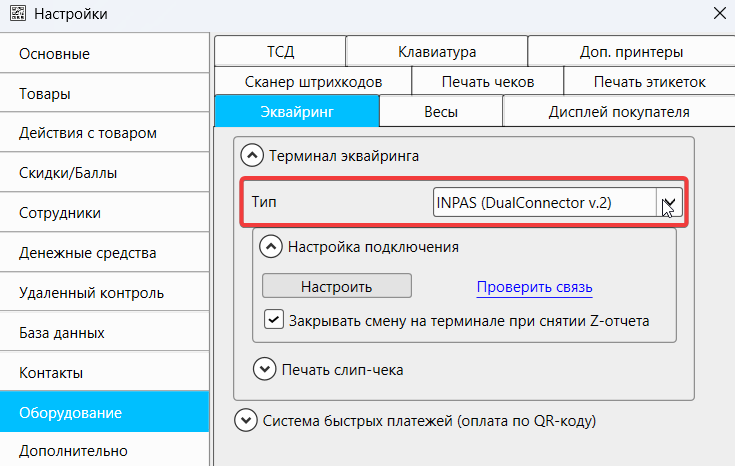 - Выберите тип терминала «INPAS (DualConnector v.2)».