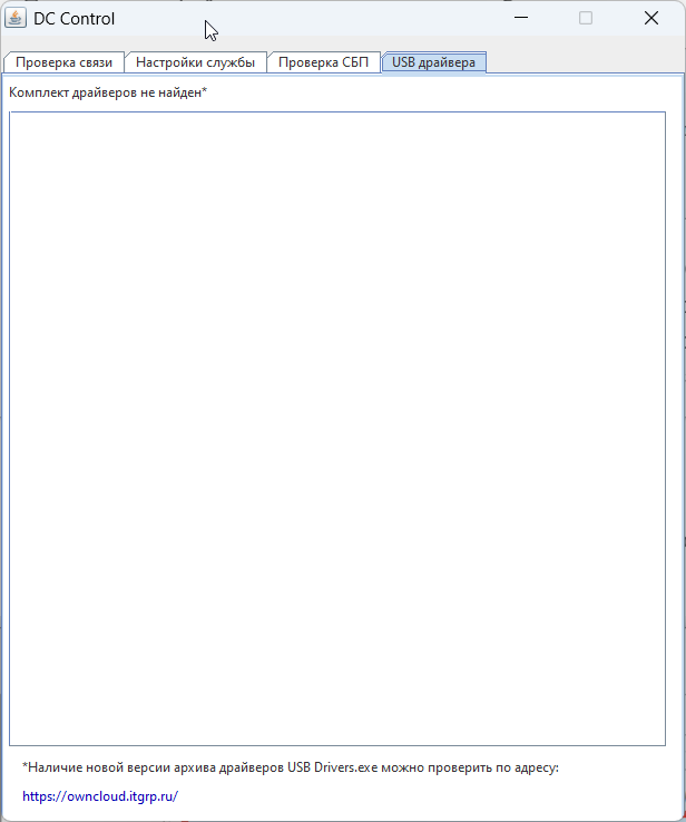 При нажатии «ОК» откроется окно DC Control с пустой вкладкой «USB драйвера»