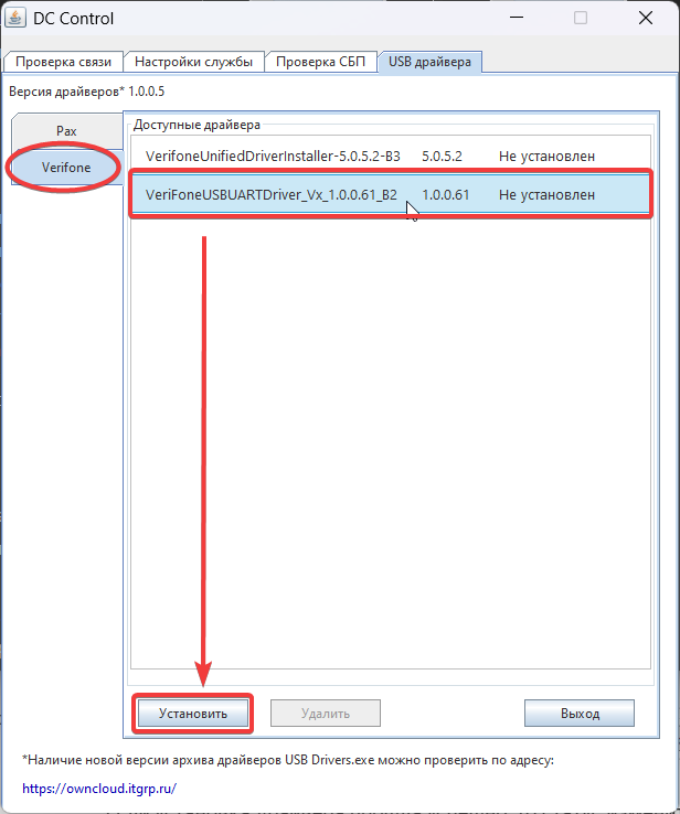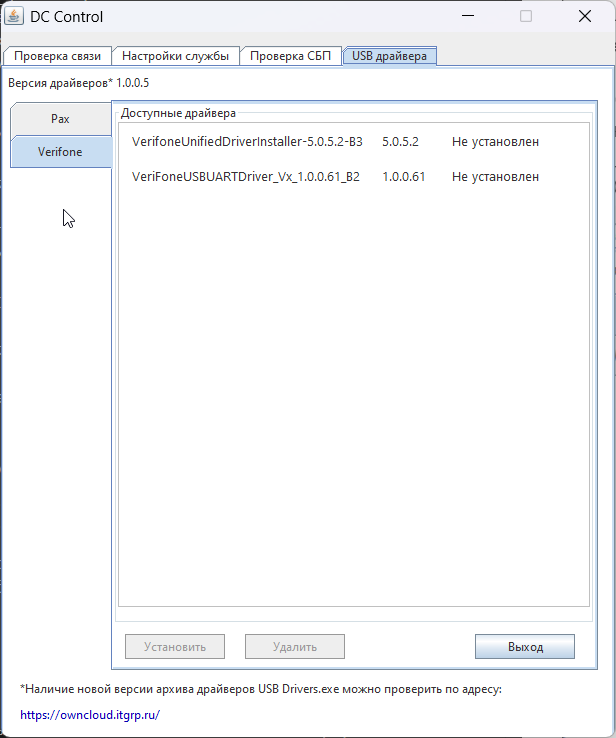 При подключении терминала через USB в приложении DC Control необходимо установить драйвера для терминала.