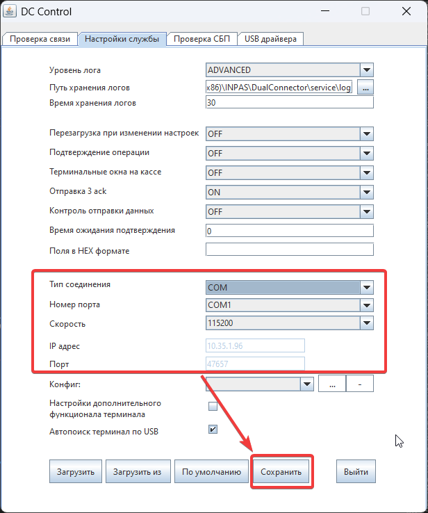 Для того чтобы служба DC Service смогла соединиться с эквайринг-терминалом, необходимо указать корректные настройки подключения.