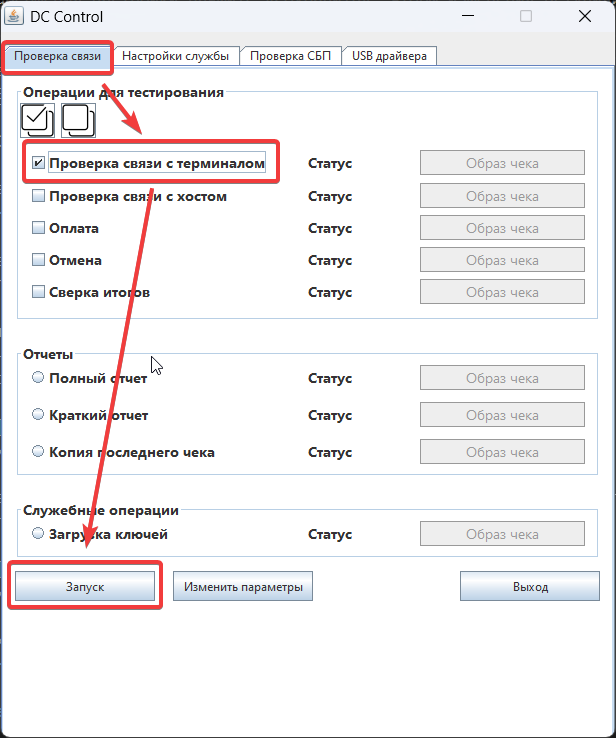 Перейдите на вкладку проверка связи в приложении DC Control, оставьте включенным опцию «Проверка связи с терминалом» и нажмите «Запуск», как показано на скриншоте.