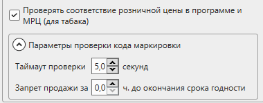 - проверять соответствие розничной цены и МРЦ (для табака) – включает ограничение для продажи табачной продукции по некорректной цене