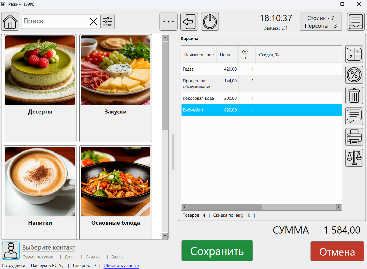 Ниже показана основная форма режима «Кафе». Внешний вид может зависеть от настроек, которые доступны из меню главной формы: «Файл» – «Настройки» – «Кафе».