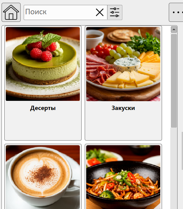 На скриншоте выше показано меню с поиском. В корневом разделе меню режима «Кафе» отображается верхний уровень категорий.