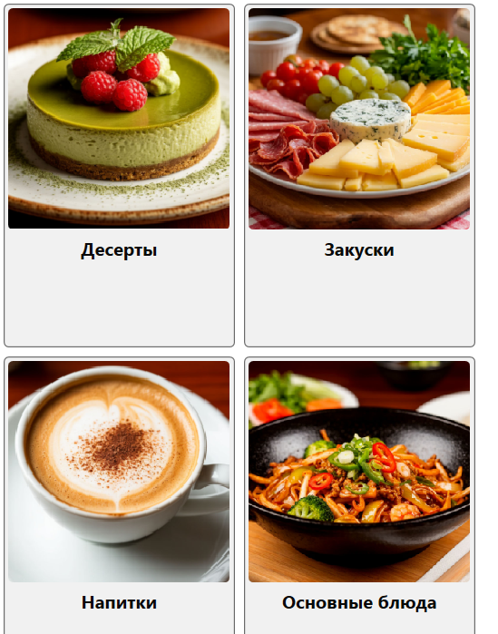 Чтобы перейти к списку блюд (товаров), входящих в категорию – кликните на карточку категории.