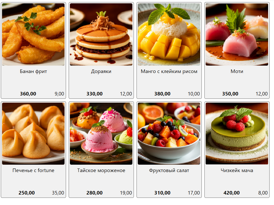 Выше показан список блюд (товаров), входящих в категорию «Десерты». Для карточки блюда в меню можно установить картинку или фотографию. Сделать это можно в карточке товара.