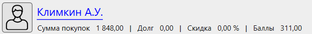 Панель контакта позволяет выбрать посетителя (покупателя) и увидеть информацию о его сумме покупок, скидке, накопленных баллах и текущей задолженности.