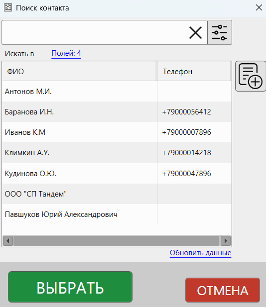 Кнопка «Выберите контакт» позволяет выбрать или сбросить контакт (покупателя). При нажатии на кнопку выбора контакта программа отобразит окно поиска контактов.