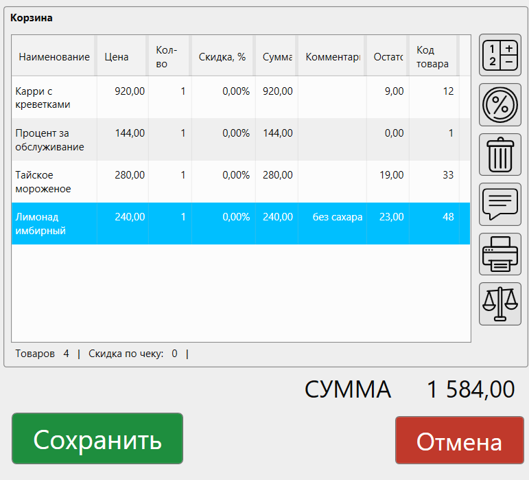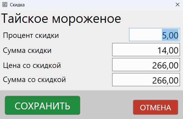 Кнопка «Скидка» позволяет изменить скидку для выбранных блюд. Выберите одну или несколько позиций и нажмите кнопку «Скидка», чтобы установить значение.