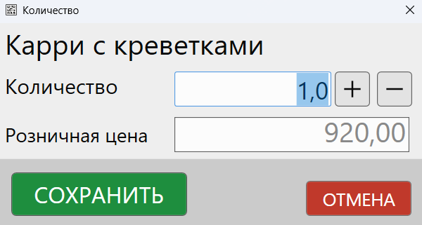 Ввод количества для блюда в режиме «Кафе»
