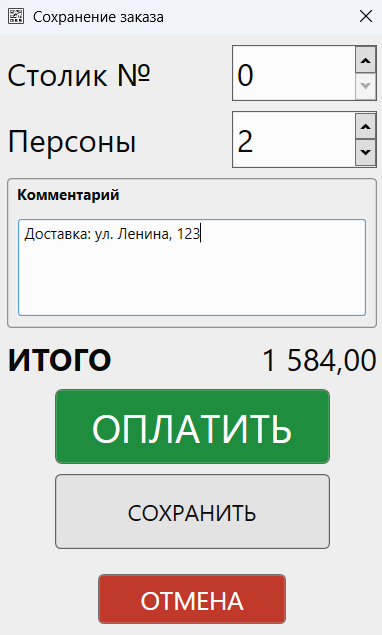 Форма сохранения заказа в режиме «Кафе»