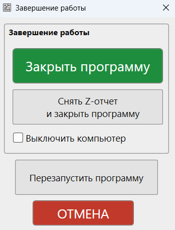 - Снять Z-отчет и закрыть программу – выполняет закрытие смены на ККМ и завершает работу программы