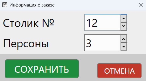 При нажатии на кнопку будет открыта форма ввода информации о номере столика и количестве персон, обслуживаемых в рамках текущего заказа.